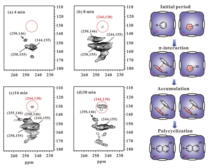 该研究工作从沸石分子筛上“烃池”物种之间的空间邻近性和相互作用出发,对MTH反应中催化剂的失活机制进行了研究。首次利用二维固体NMR实验发现环戊烯碳正离子与芳烃之间的π相互作用,揭示了分子筛积碳形成机制,研究结果对于高性能催化剂的开发以及反应工艺的优化具有一定的指导意义。相关研究结果发表在Angew. Chem. Int. Ed.杂志上。