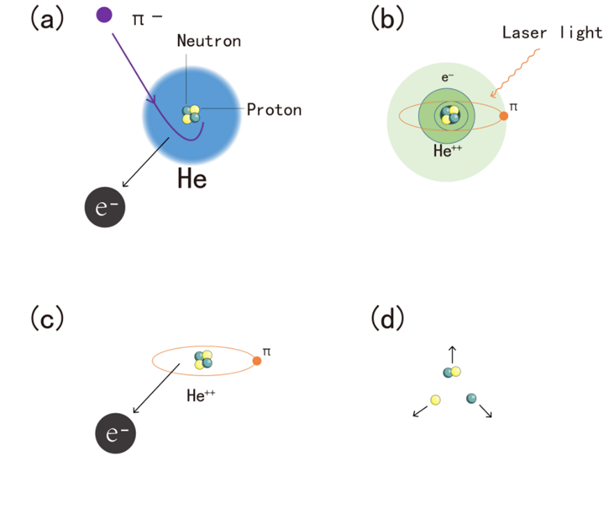 在鲍威尔发现宇宙射线中π介子的同年,“原子能之父”著名物理学家费米等人预言π-介子取代正常原子中的电子后可以形成各种奇异原子。这些奇异原子像“容器”一样将π-介子存储在分立原子轨道上,使我们可以利用激光技术加以研究。PSI 拥有领先世界的高亮度 1.3 MW 质子环形回旋加速器,这使得 PiHe 合作组能够取得高通量的π-介子束流。如图所示,π-介子束流轰击氦靶,会将氦原子的一个基态电子敲掉并占据该电子的空间位置,并被较为稳定的亚稳态轨道“囚禁”起来。这些独特的亚稳态轨道与原子核距离较远,因此可以保护π-介子在几十纳秒之内不被原子核俘获,这使得激光光谱探测成为可能。随后,剩余的一个电子也被发射出去,π-介子落入低轨道并被原子核吸收,核裂变反应产生质子、中子和氘核。