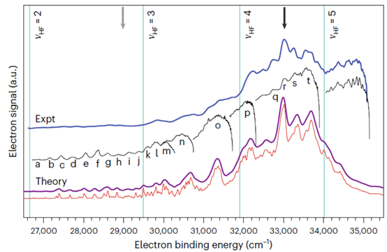 Feshbach共振态是一种很特殊的量子动力学现象,其标记依赖精确的量子动力学计算。宋宏伟副研究员从2016年开始就致力于开发计算五原子分子体系光电谱的理论方法,提出了高精度势能面的构建方法(J. Phys. Chem. A 126, 352 (2022))和精确的量子动力学计算方法(Phys. Chem. Chem. Phys. 23, 22298 (2021)),为标记实验光电子谱和理解多原子分子反应微观机理打下良好的理论基础。