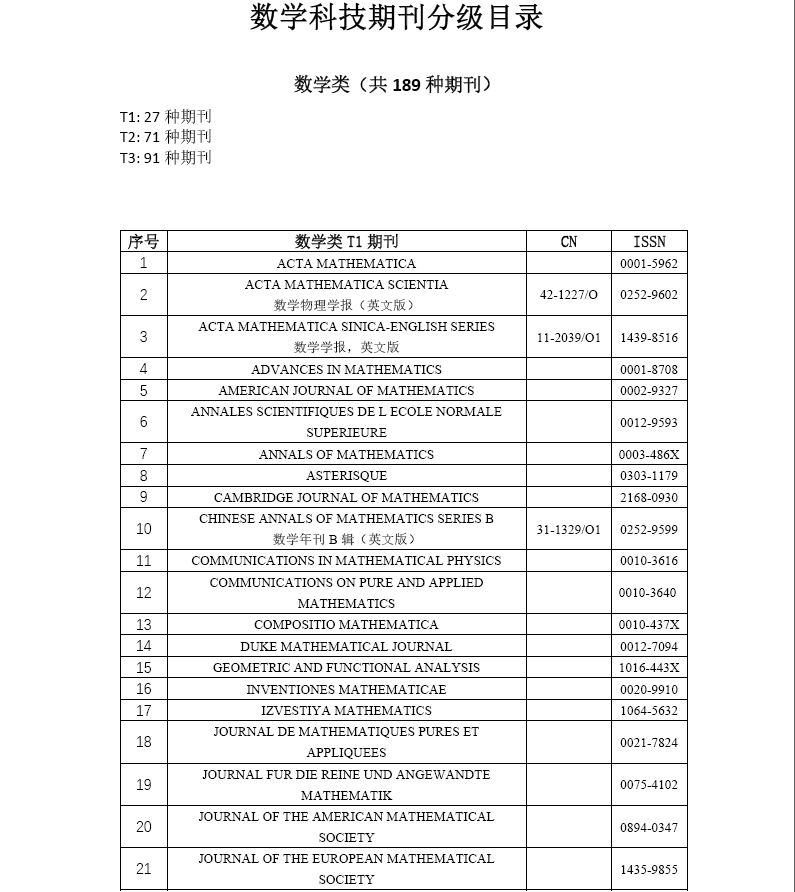为深入贯彻落实中国科协、中宣部、教育部、科技部《关于深化改革培育世界一流科技期刊的意见》,有助于中外科技期刊同质等效,吸引高水平论文在中国科技期刊首发,加快推进世界一流科技期刊建设,根据中国科协统一部署,中国数学会承担了中国科协“发布我国数学领域高质量期刊分级”工作。数学领域高质量科技期刊分级目录的试点成果自2021124日公示以来,受到了社会各界的广泛关注。20214月,中国数学会组织专门的具有广泛代表性的专家委员会召开工作会议逐条充分讨论公示期收到的意见,并对数学期刊分级进行了适当的调整。调整后的期刊分级目录经2021年中国数学会常务理事会审定调整顺利获得后按要求公布。