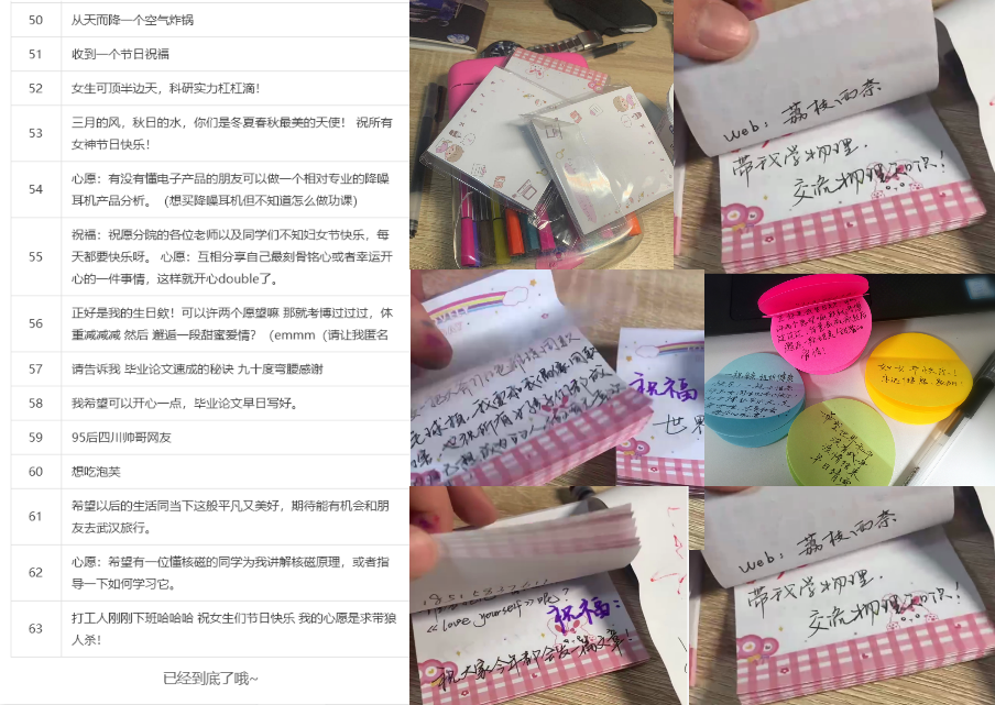 节日前夕,瓦力游戏官方研究生顺利获得线上方式写下了心愿和节日祝福,研究生会的同学们将它们一份份手抄下来,并在3月8日当天,贴在小洪山和东湖两个园区的“心愿树”上(线上征集的心愿与祝福详见文末)。